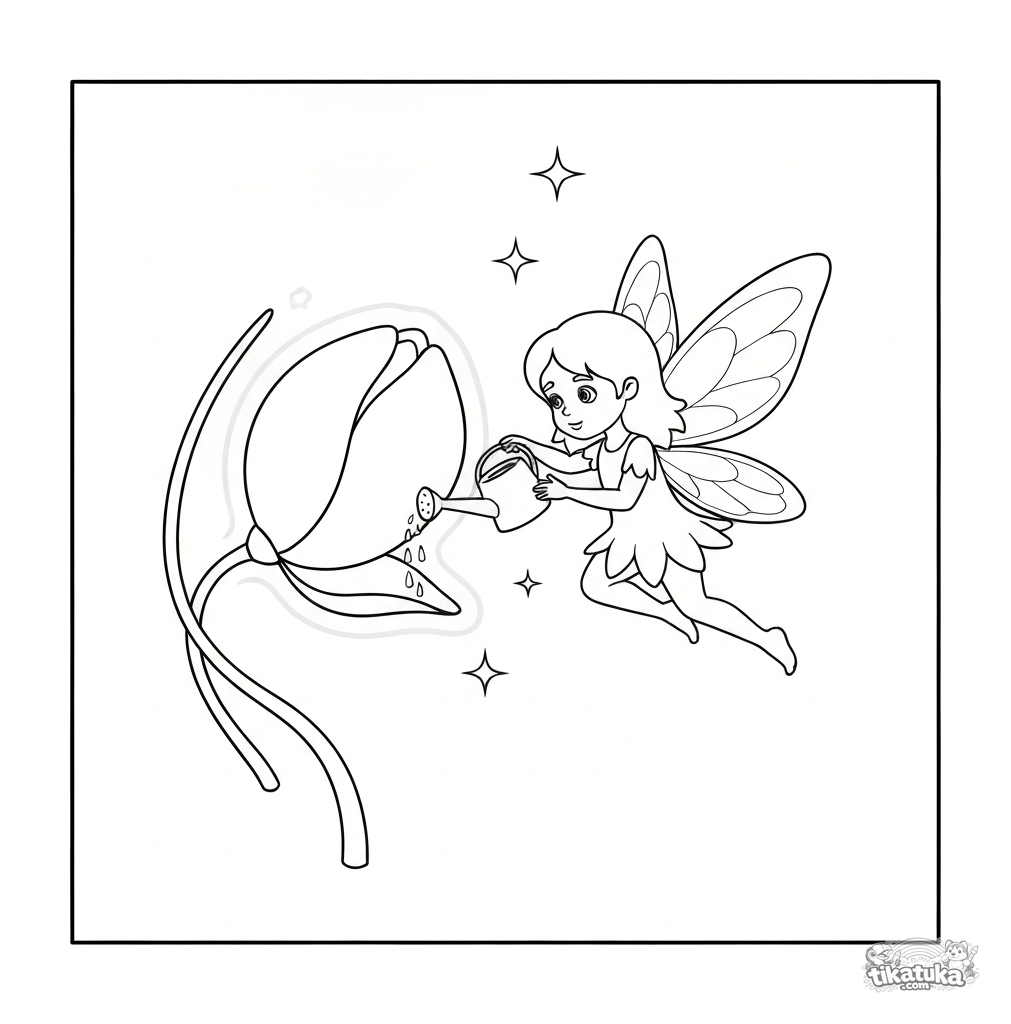 Ausmalbild für Kinder: eine winzige Fee gießt eine riesige leuchtende Blumenknospe. Realistische, aber einfache Zeichnung mit magischer Stimmung, für 3-5 Jahre.