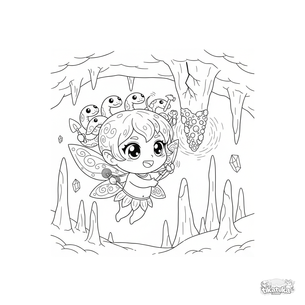Chibi-Stil Ausmalbild für Kinder 4-6: Eine winzige Gorgonen-Fee mit Flügeln repariert einen Stalaktiten in ihrer Höhle mit magischem Moos. Niedliche Szene.