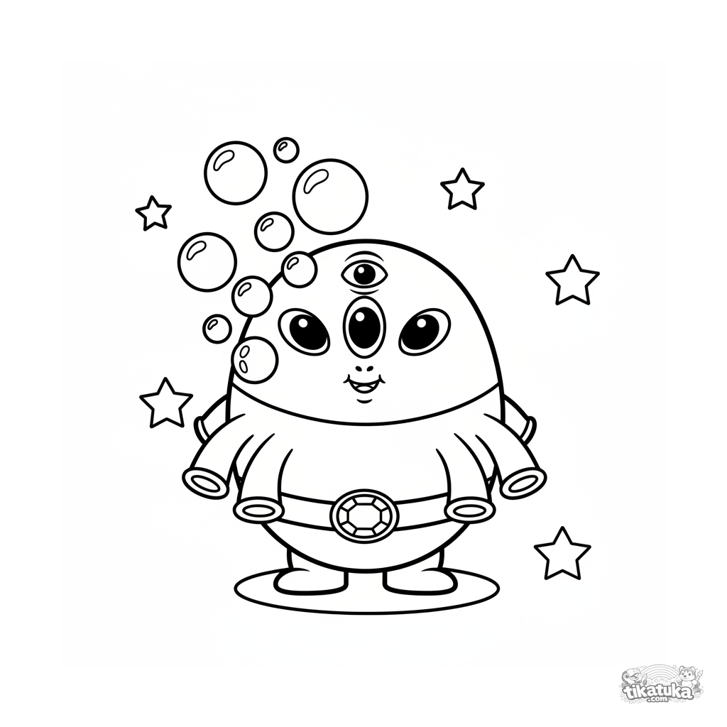 Ausmalbild für Kleinkinder: ein süßes, pummeliges Alien bläst Seifenblasen zwischen den Sternen. Einfache Formen, breite Ränder.