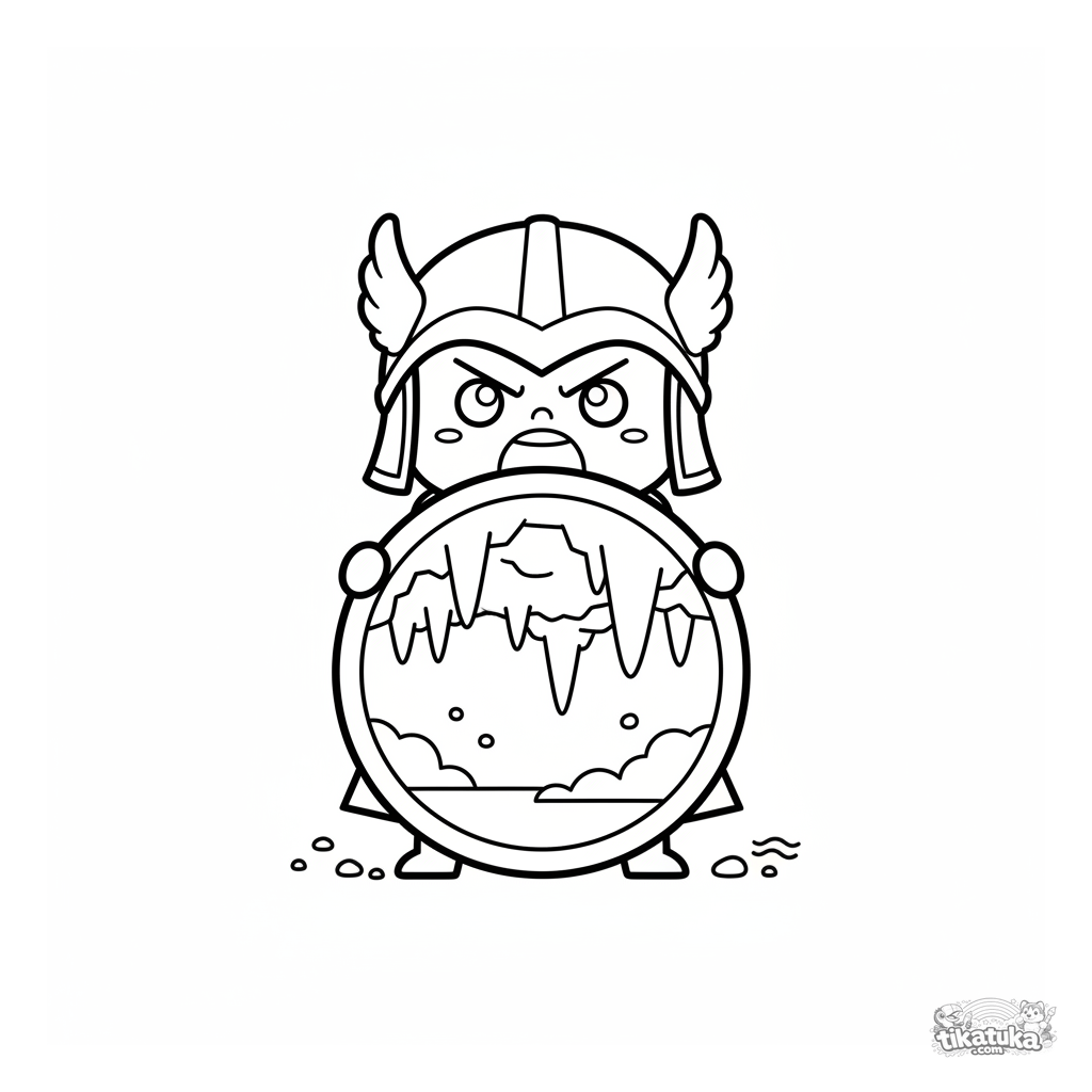 Einfaches Ausmalbild für Kleinkinder 2-3: Ein winziger mythologischer Held mit einem großen Schild in der Gorgonenhöhle.