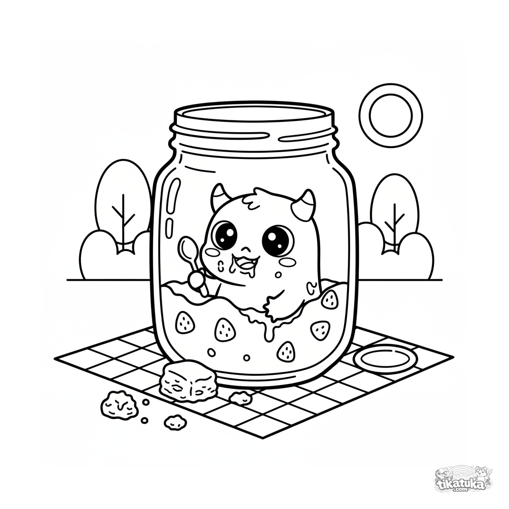 Ausmalbild für Kinder 4-6: Ein winziges, gehörntes Monster versteckt sich in einem Marmeladenglas auf einem Picknick. Lustige Szene.