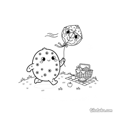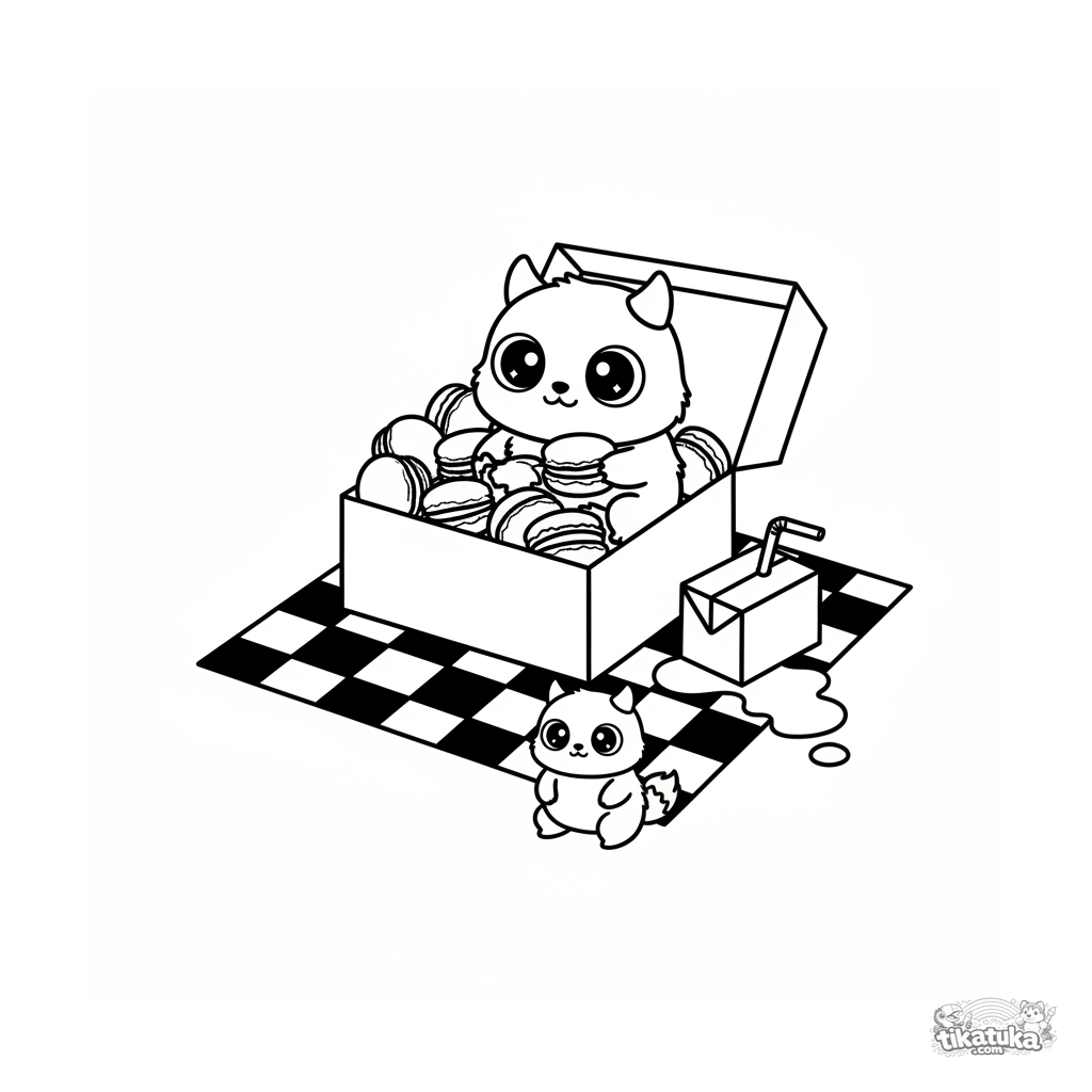 Kinder-Ausmalbild: Ein winziges, gehörntes Monster lugt neugierig aus einer Makronenbox auf einem Picknick. Niedliche und lustige Szene.