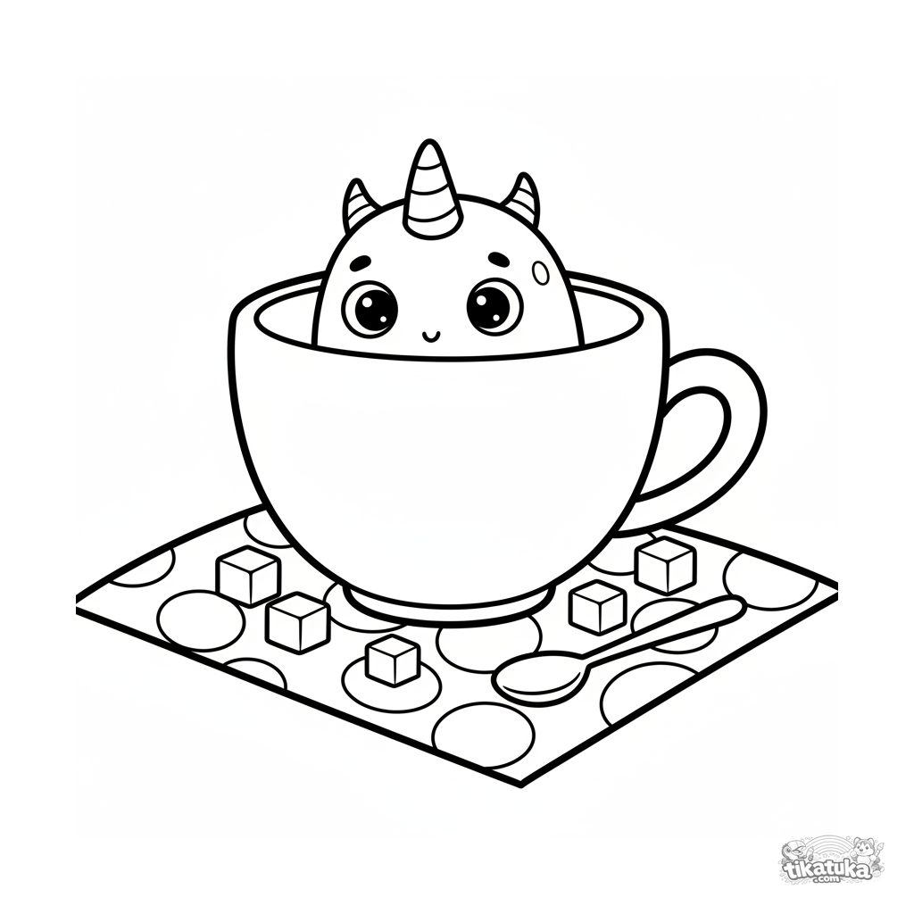 Sehr einfaches Ausmalbild für Kleinkinder von 2-3 Jahren: ein winziges gehörntes Monster lugt aus einer großen Teetasse beim Picknick. Große, klare Formen.