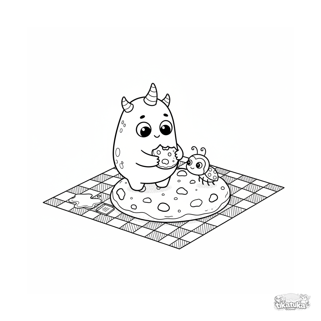 Ausmalbild für Kinder von 7-9 Jahren: ein winziges gehörntes Monster teilt einen Keks mit einem Marienkäfer beim Picknick.