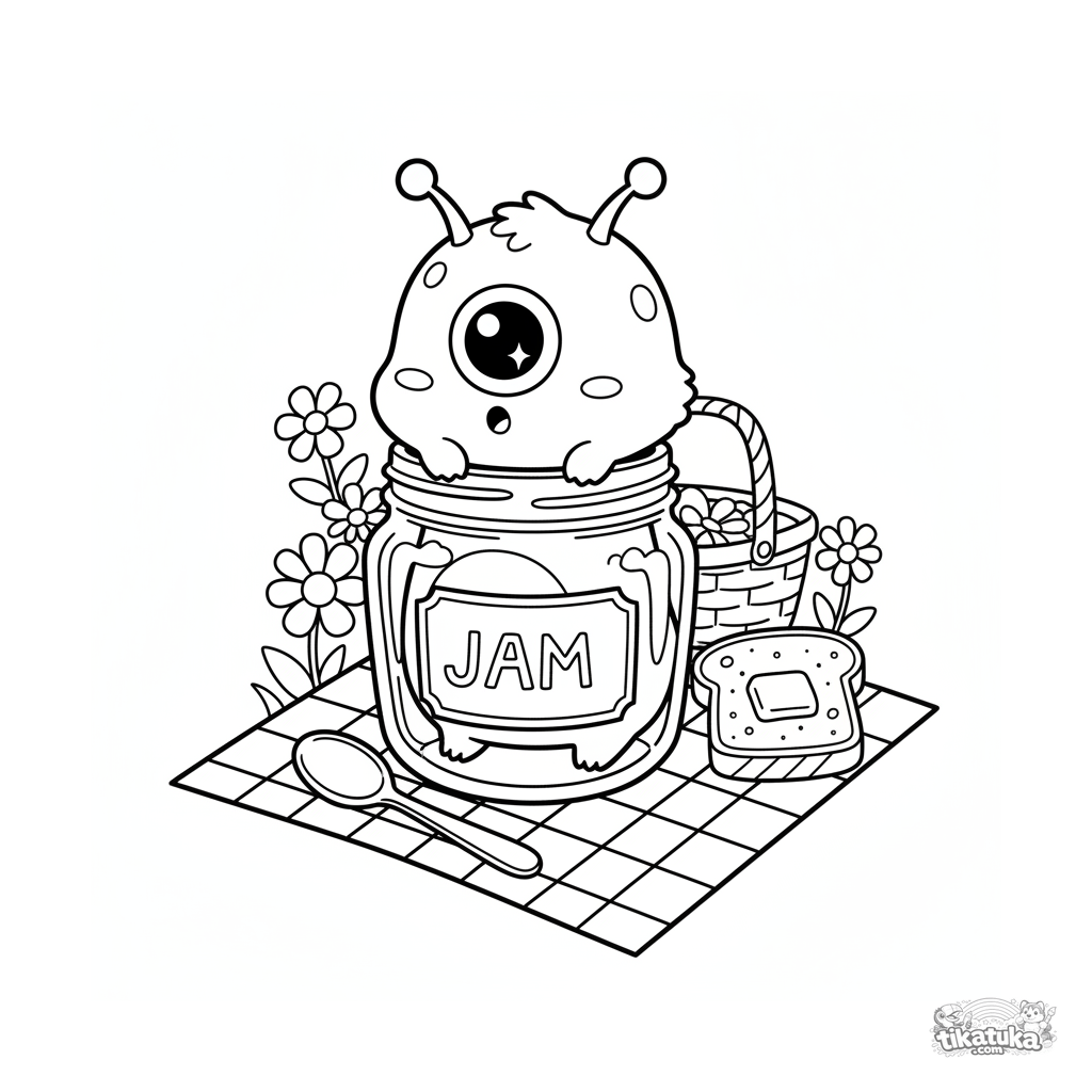 Ausmalbild für Kinder 4-6 Jahre: ein winziges süßes Monster lugt aus einem Marmeladenglas auf einem Picknick hervor.