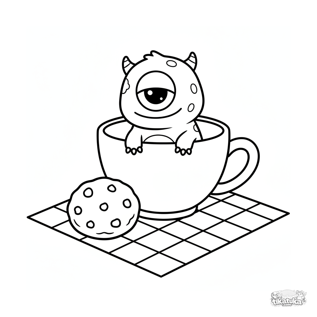 Sehr einfaches Ausmalbild für Kleinkinder 2-3: ein winziges Monster lugt aus einer großen Teetasse. Große, klare Formen.