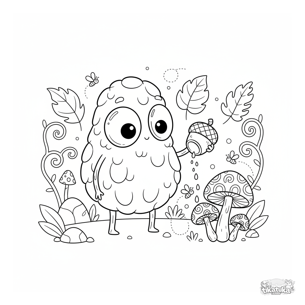 Ausmalbild eines Moosgolems im Zauberwald. Für Kinder von 4-6 Jahren. Freundliche Kreatur gießt leuchtende Pilze auf einer Lichtung.
