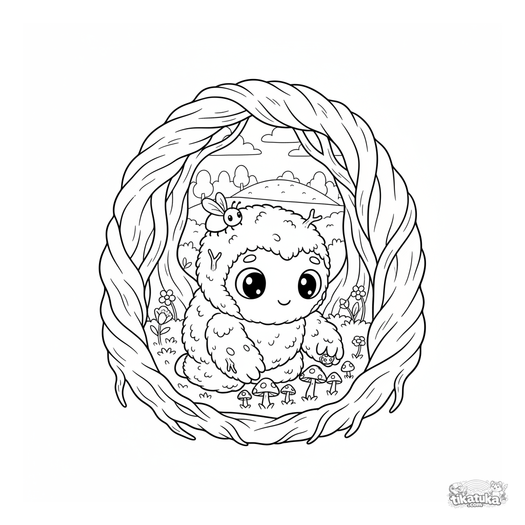 Ausmalbild eines Moosgolems, der leuchtende Pilze in einer Höhle aus alten Baumwurzeln pflegt. Für Kinder von 4-6 Jahren.