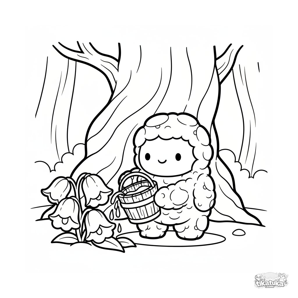 Einfaches Ausmalbild für Kleinkinder 2-3: Ein süßer Moos-Golem gießt leuchtende Blumen in einem verzauberten Wald. Große einfache Formen.
