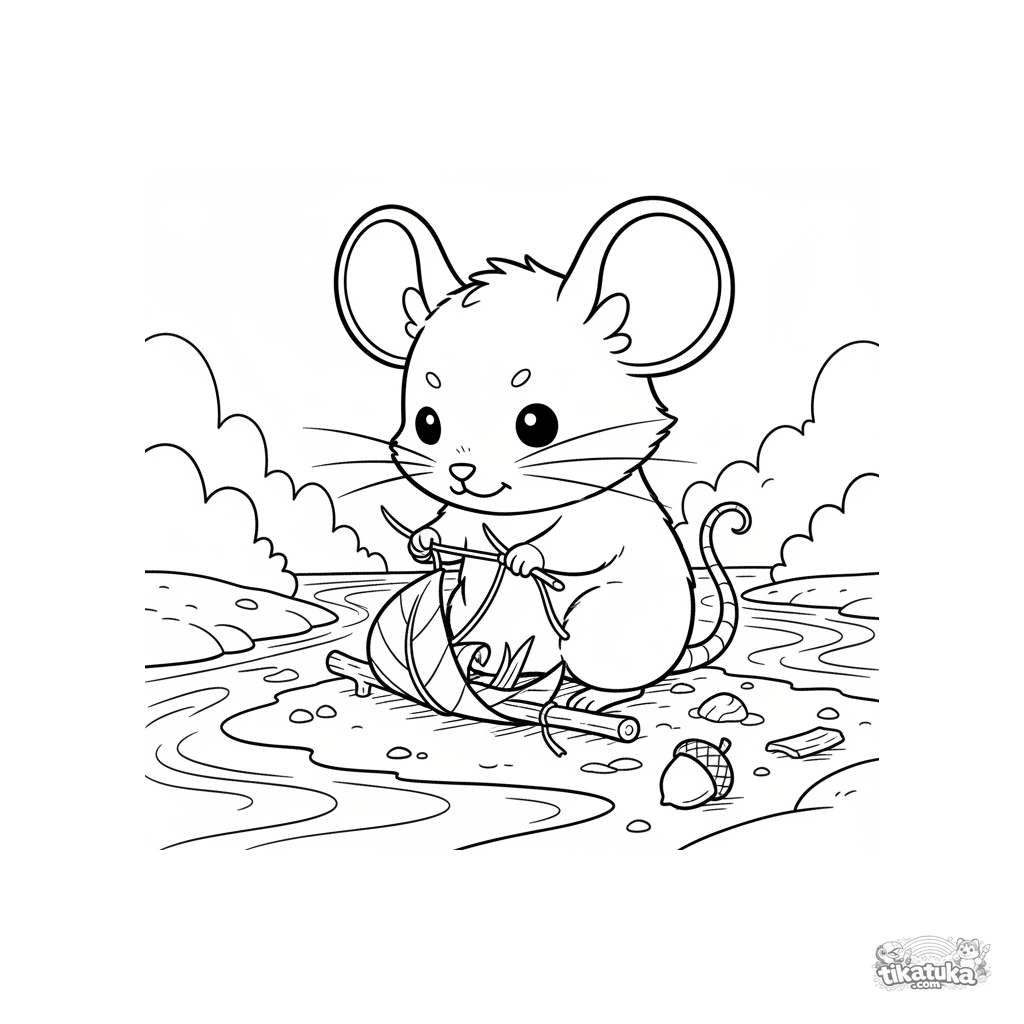 Ausmalbild für Kinder 7-9 im Chibi-Stil: Eine winzige Maus baut ein Blattboot am Bachufer. Eine lustige und einfallsreiche Szene.