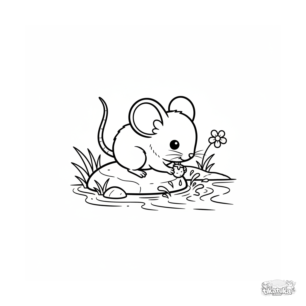 Niedliches Chibi-Stil Ausmalbild für Kinder 4-6: Eine winzige Feldmaus trinkt von einem Bach, während sie auf einem Stein sitzt und eine wilde Beere in ihren Pfötchen hält.