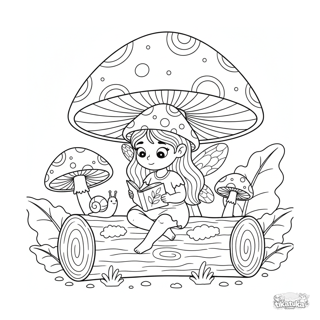 Ausmalbild für Kinder 4-6: eine winzige Pilzfee liest ein Buch unter einem leuchtenden Pilz im Zauberwald. Niedliche und friedliche Szene.