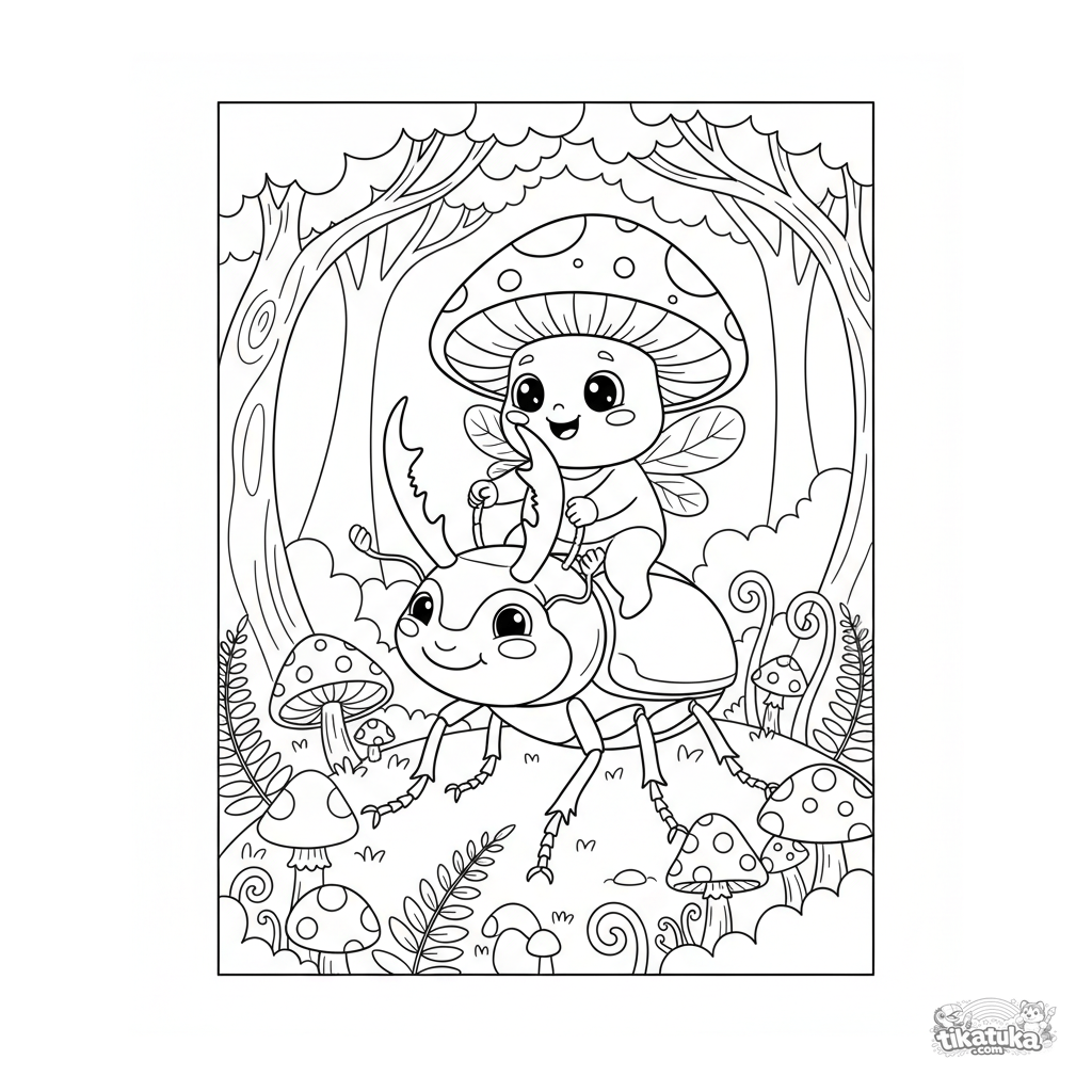 Ausmalbild für Kinder 4-6: Ein Pilz-Elf reitet auf einem Riesenkäfer durch einen magischen Wald mit leuchtenden Pilzen.