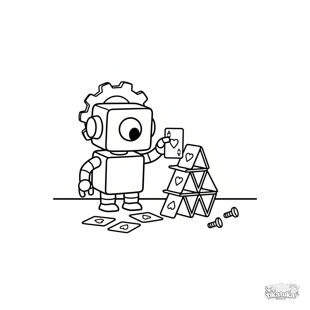 Einfaches Ausmalbild für Kleinkinder 2-3 Jahre: ein kleiner Roboter mit einem Zahnradkopf baut einen Turm aus Spielkarten. Große Formen, minimale Details.