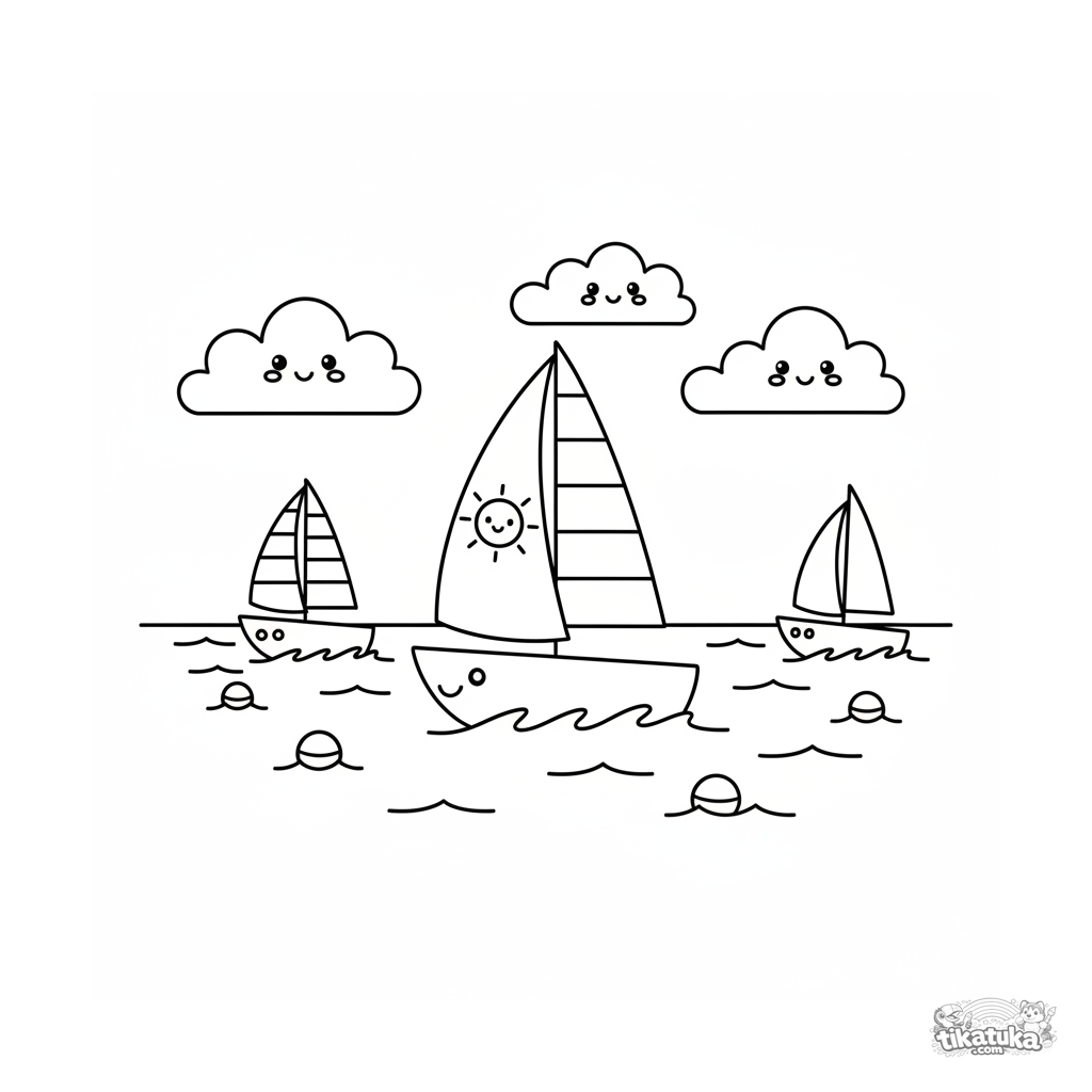 Ausmalbild für Kinder 4-6 Jahre: drei winzige Segelboote rasen über einen sonnigen See. Helle, einfache Formen im Flat-Vector-Stil.