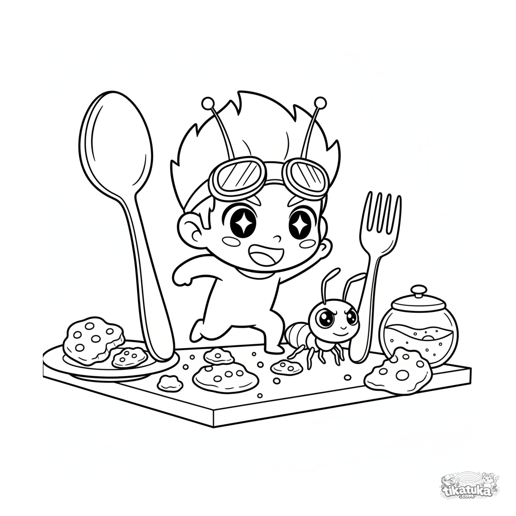 Ausmalbild eines winzigen Schrumpfhelden, der über einen riesigen Küchentisch springt, mit einer Ameise als Sidekick. Für Kinder von 4-6 Jahren.