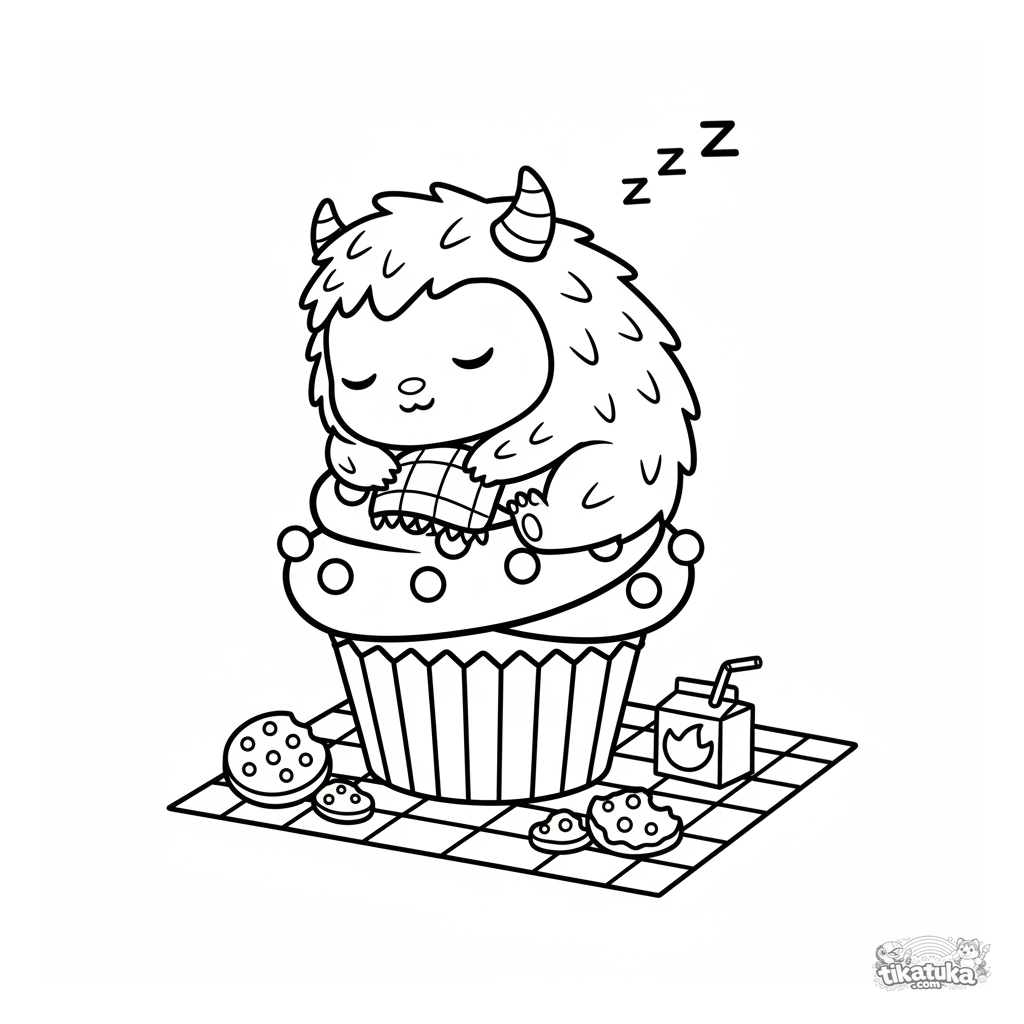 Kleinkind-Ausmalbild: Ein winziges, stacheliges Monster schläft tief auf einem Riesen-Cupcake bei einem Picknick. Große einfache Formen für 2-3 Jahre.
