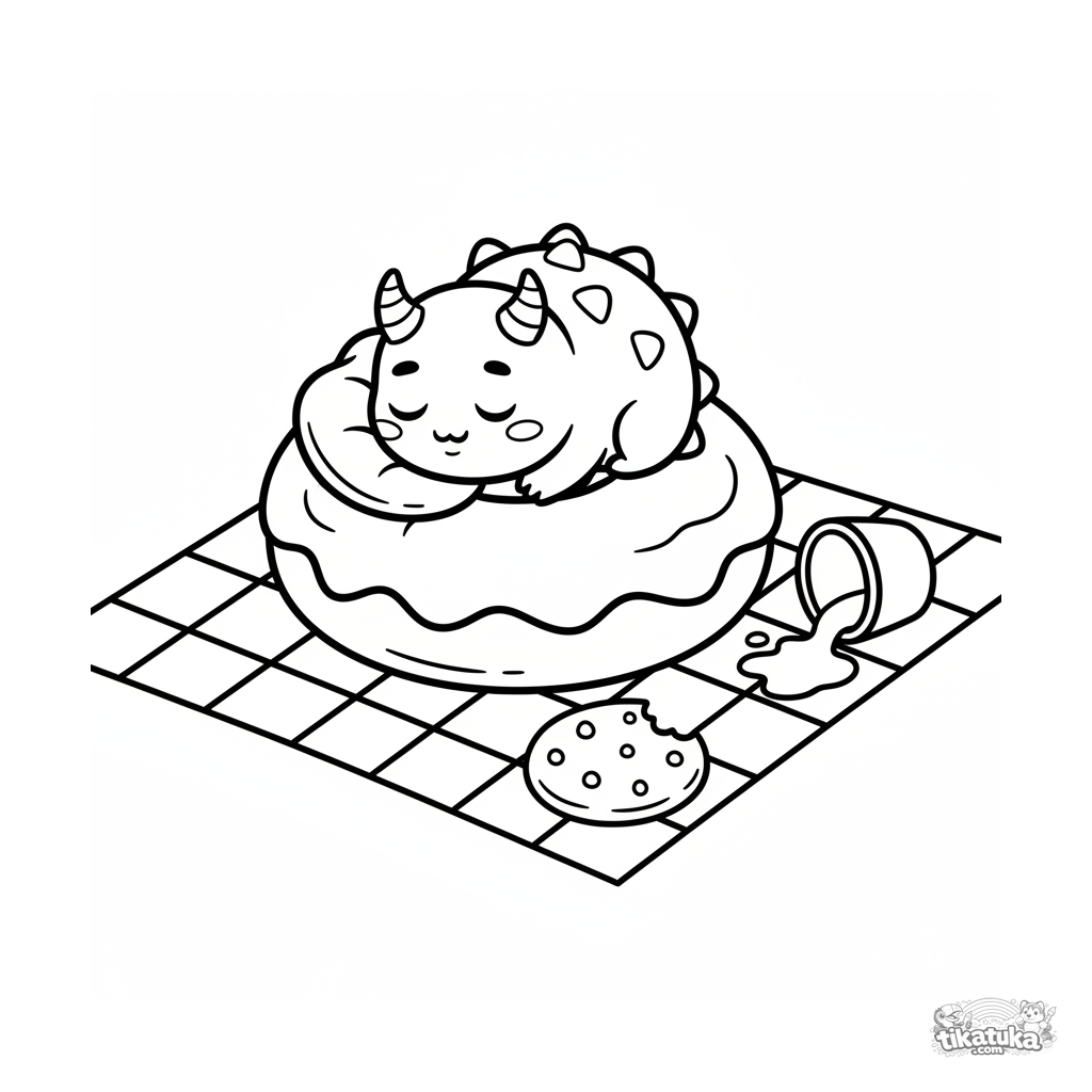 Einfaches Ausmalbild für Kleinkinder 2-3: Ein winziges, stacheliges Monster schläft fest auf einem riesigen Gelee-Donut auf einem Picknick. Große Formen, wenige Details.