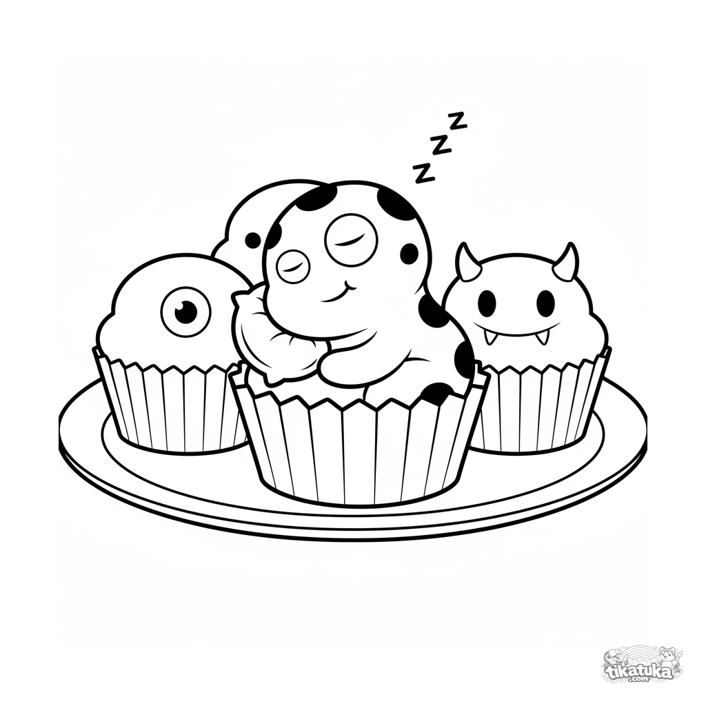 Einfaches Ausmalbild für Kleinkinder 2-3: Ein winziges, gepunktetes Monster schläft in einer Muffinform auf einem Picknick. Große Formen, wenige Details.