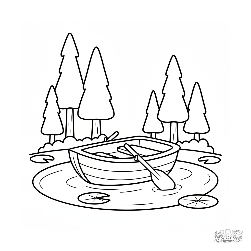 Ausmalbild für Kleinkinder: ein kleines Ruderboot auf einem ruhigen, nebligen Waldsee. Einfache Formen und breite Ränder.