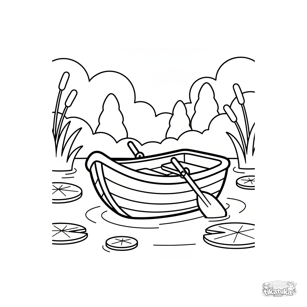 Ausmalbild für Kleinkinder: Ein kleines Holzboot schwebt auf einem ruhigen, nebligen See. Einfache Formen und weite Ränder sind perfekt für erste Malerfahrungen.