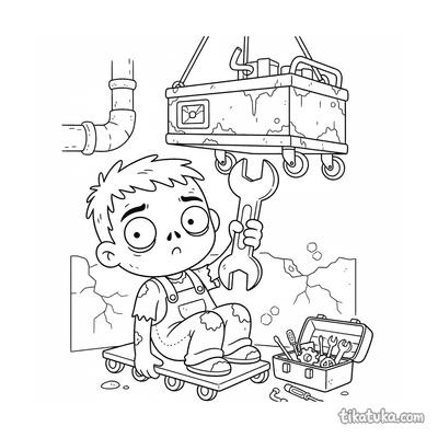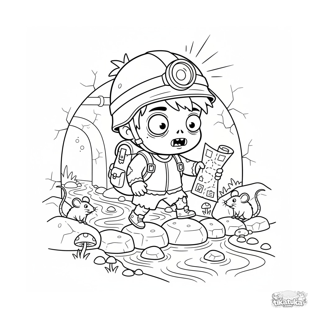 Ausmalbild eines niedlichen Zombie-Entdeckers, der einen Bach im Kanaltunnel überquert. Für Kinder von 4-6 Jahren. Einfache Formen und freundlicher Charakter.