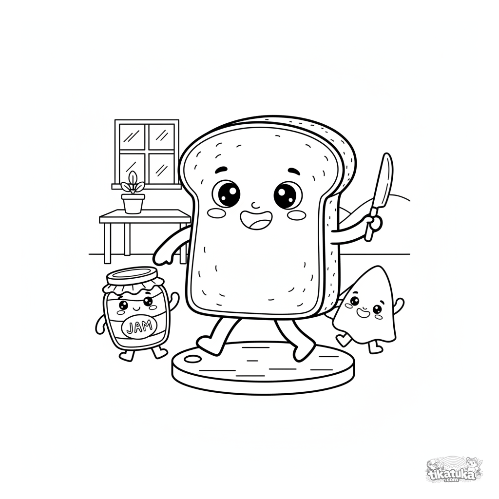Ausmalbild einer Toast-Scheibe, die mit einem Butter-Messer-Stab über ein Schneidebrett marschiert. Für Kinder von 4-6 Jahren. Mit knuspriger Kante, einem Marmeladenglas und einer Serviette.