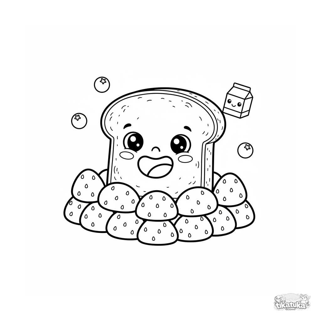 Ausmalbild für Kinder 4-6: Eine Toast-Scheibe spielt Verstecken hinter einer Mochi-Mauer. Saubere Umrisse und verspielte Stimmung.