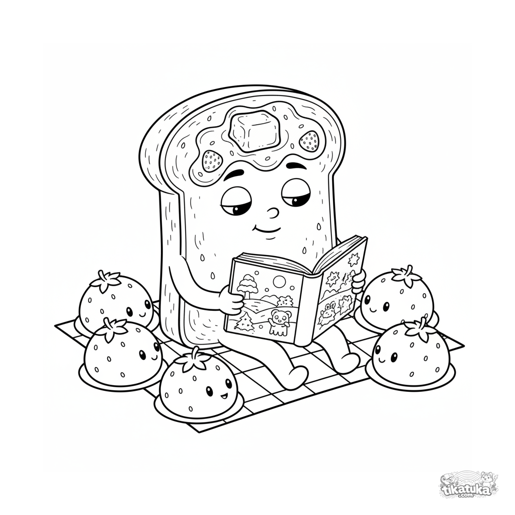 Detailliertes Ausmalbild für ältere Kinder 10-12: Eine Toast-Scheibe liest einem Kreis von Erdbeer-Mochi auf einer Picknickdecke vor. Texturen und gemütliche Atmosphäre.