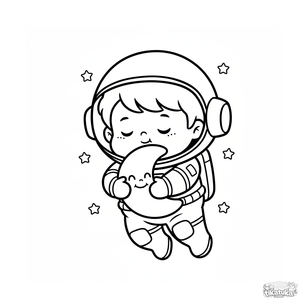 Einfaches Ausmalbild für Kleinkinder 2-3: Ein Kind als Astronaut umarmt ein Mond-Plüschtier im Weltraum. Große Flächen zum Ausmalen, sehr dicke Umrisse.
