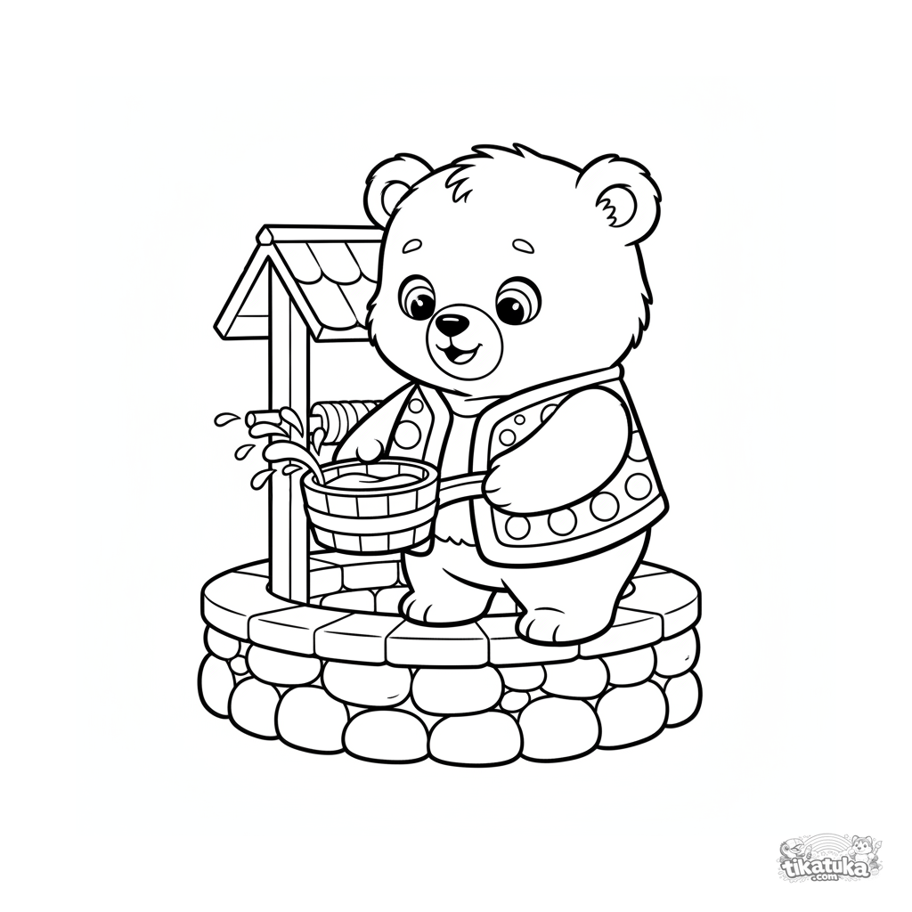 Ganz einfaches Ausmalbild für Kleinkinder 2-3: Ein süßes Bärenjunges am Brunnen betrachtet einen Schöpflöffel mit Wasser. Große Formen, dicke Umrisse.