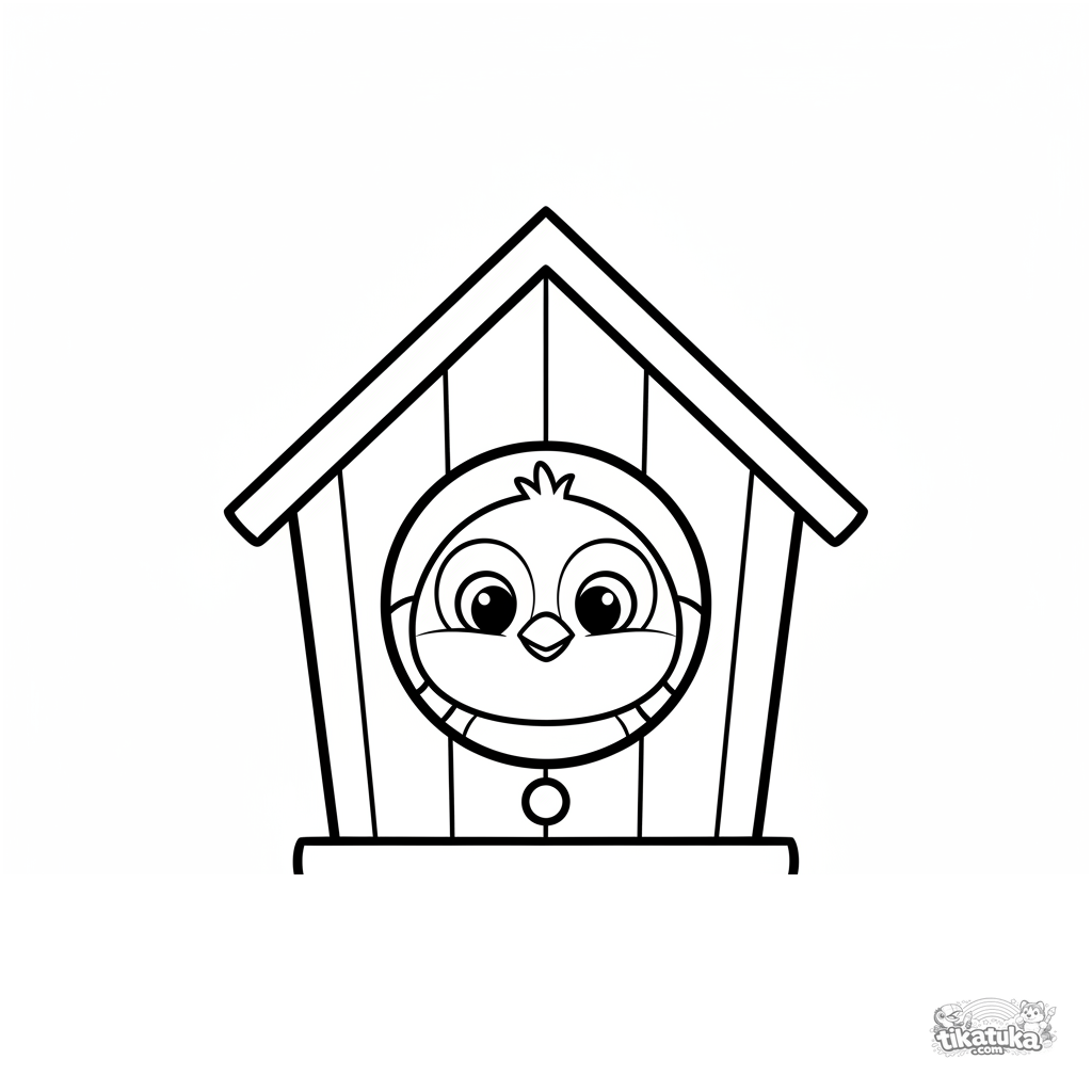Ganz einfaches Ausmalbild für Kleinkinder 2-3: Eine süße Blaumeise lugt aus einem Vogelhaus. Große Formen, dicke Umrisse, perfekt für erste Buntstifte.