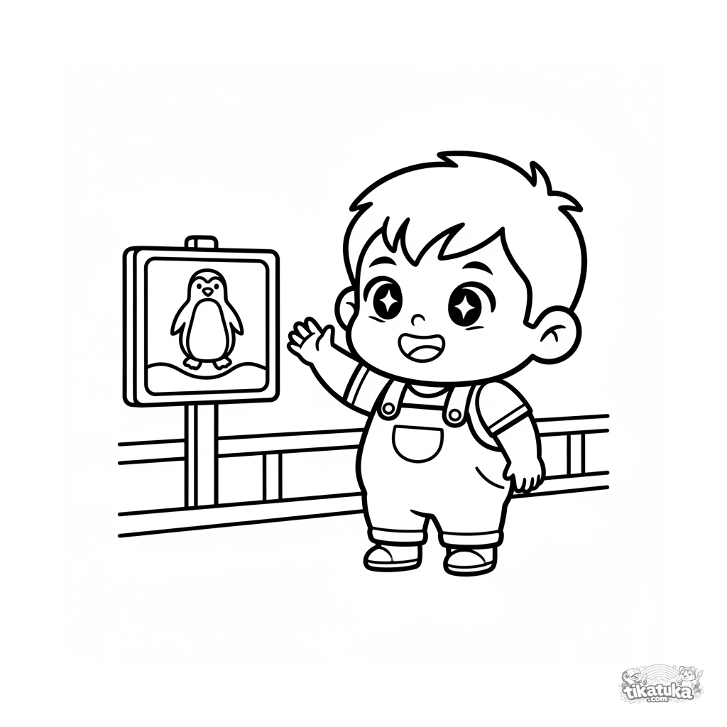Einfaches Ausmalbild für Kleinkinder 2-3: Ein Junge winkt glücklich einem Pinguin-Lebensraum-Schild im Zoo zu.