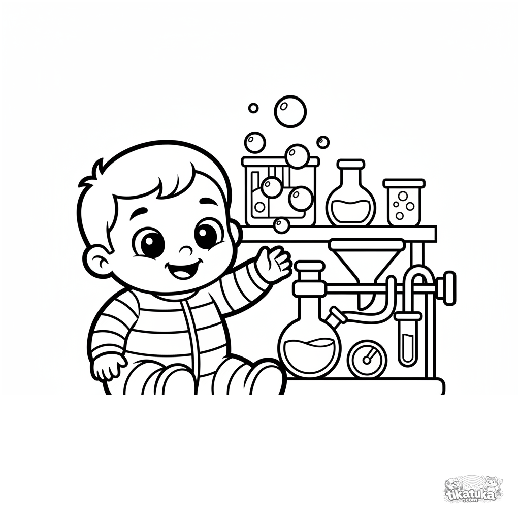 Einfaches Ausmalbild für Kleinkinder 2-3: Ein Junge im Labor freut sich über Blasen aus einer großen freundlichen Maschine.