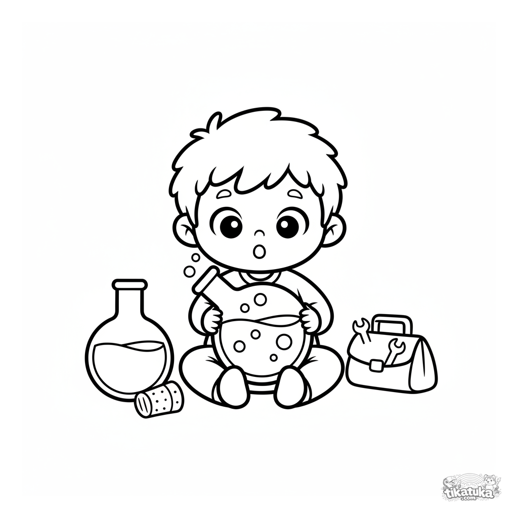 Einfaches Ausmalbild für Kleinkinder 2-3: Ein Junge mit einem großen Becherglas voll brodelndem Trank in einem geheimen Labor.