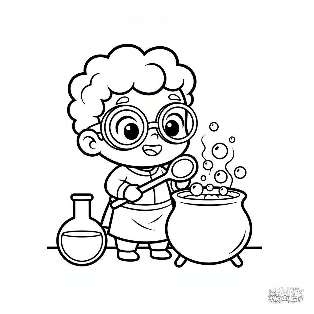 Einfaches Ausmalbild für Kleinkinder 2-3: ein Junge mit Schutzbrille vor einem brodelnden Kessel. Große Formen, breite Ränder für erste Malerfahrung.