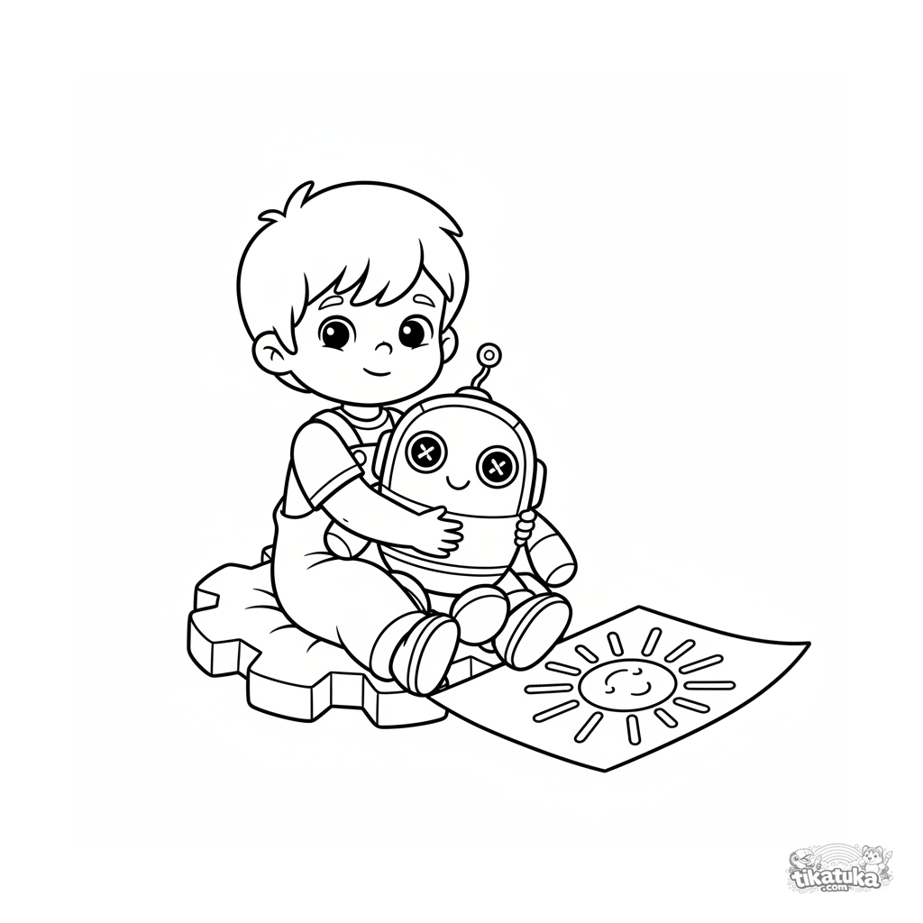 Einfaches Ausmalbild für Kleinkinder 2-3: Ein Junge umarmt einen Plüschroboter-Assistenten im Geheimlabor eines Erfinders.