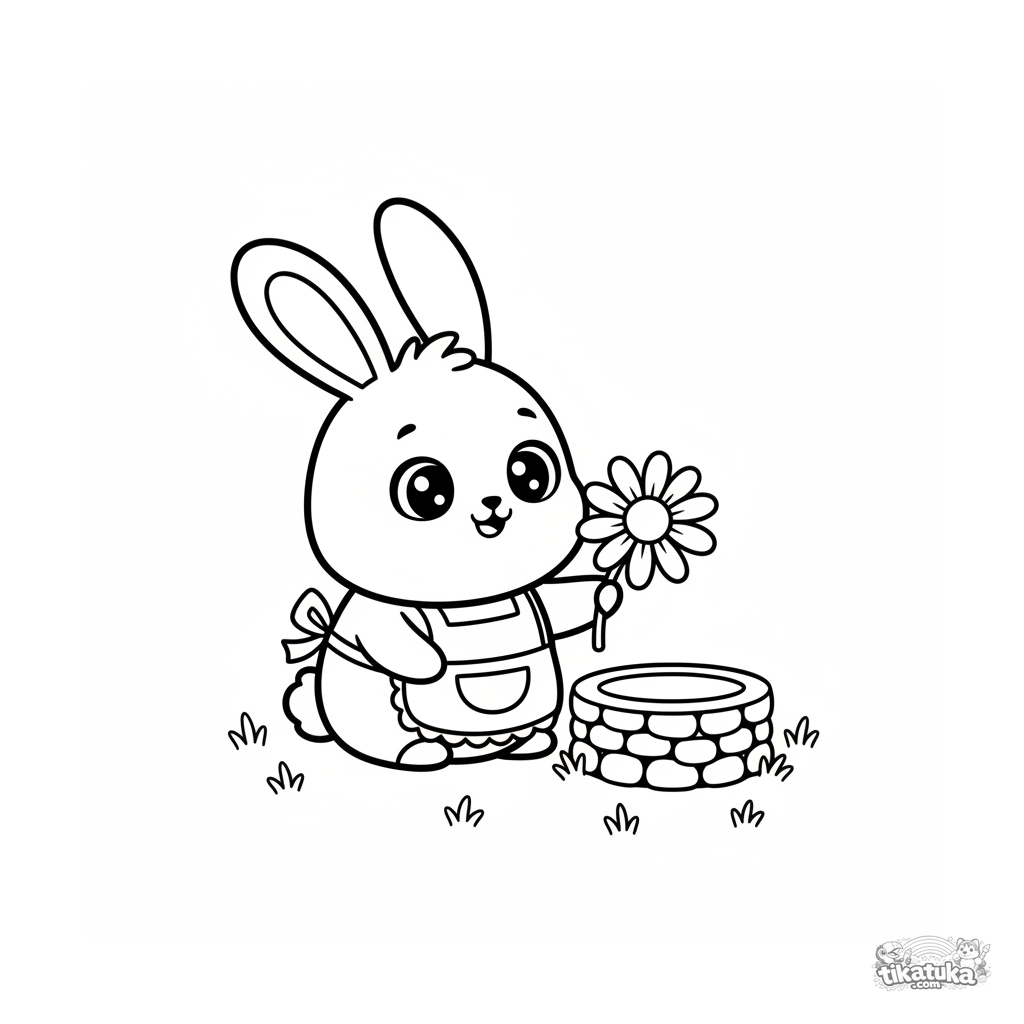Einfaches Ausmalbild im Chibi-Stil für Kleinkinder 2-3: Ein Häschen am Brunnen hält eine kleine Blume. Riesiger Kopf, süßes Gesicht, minimale Details.