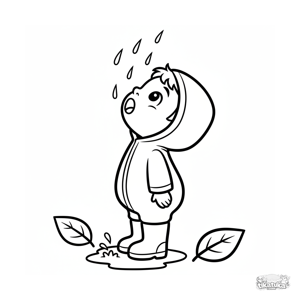 Ausmalbild für Kleinkinder 2-3 Jahre: ein Kind in einem großen Regenanzug und Stiefeln fängt Herbstregentropfen mit dem Mund.
