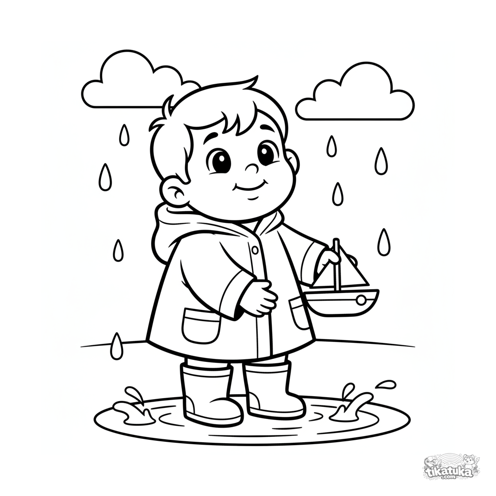 Ausmalbild für Kleinkinder 2-3 Jahre: ein fröhliches Kind in gelben Gummistiefeln und Regenjacke steht in einer Pfütze im Herbstregen. Einfache Formen, breite Ränder zum Ausmalen.