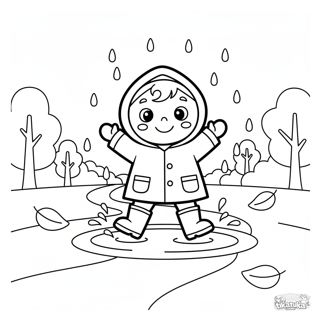 Ausmalbild für Kleinkinder 2-3 Jahre: ein fröhliches Kind in Gummistiefeln springt in eine Pfütze unter Herbstregen. Einfache große Formen, breite Ränder.