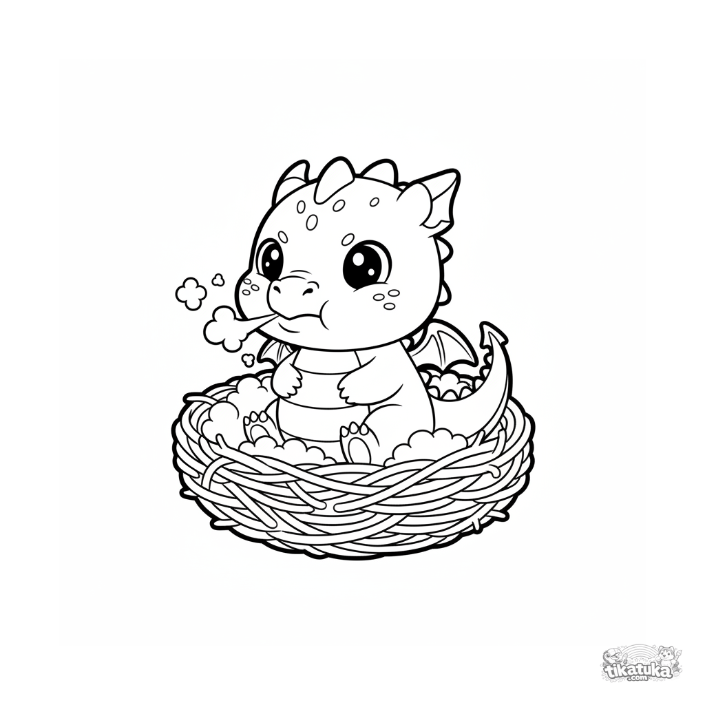Einfaches Ausmalbild für Kleinkinder 2-3: Ein Drachenbaby in einem Nest versucht, Rauchringe zu blasen. Große, freundliche Formen.