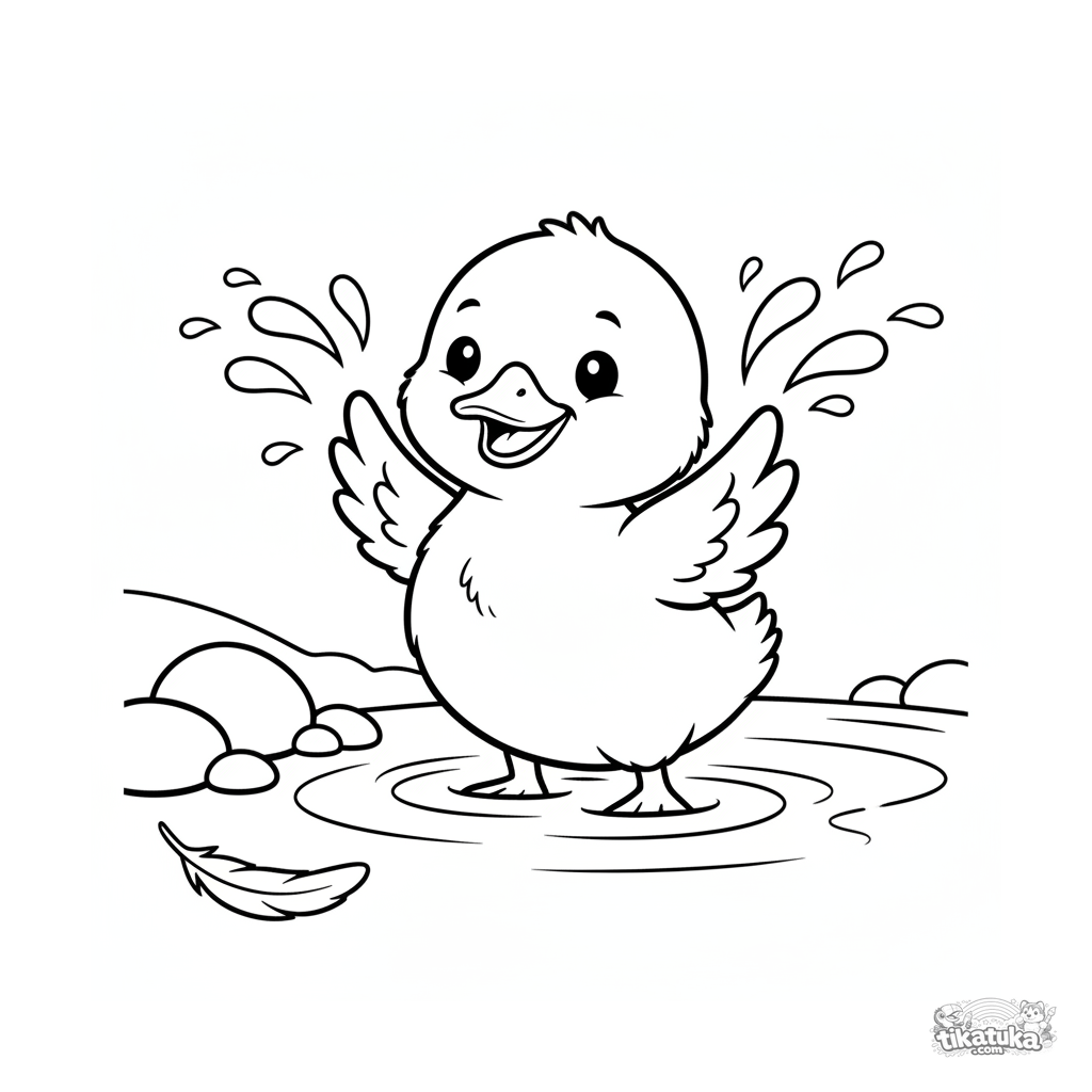 Einfaches Ausmalbild für Kleinkinder 2-3: Ein flauschiges Entenküken plantscht fröhlich in einem klaren Bach. Große, klare Formen mit breiten Rändern zum ersten Ausmalen.