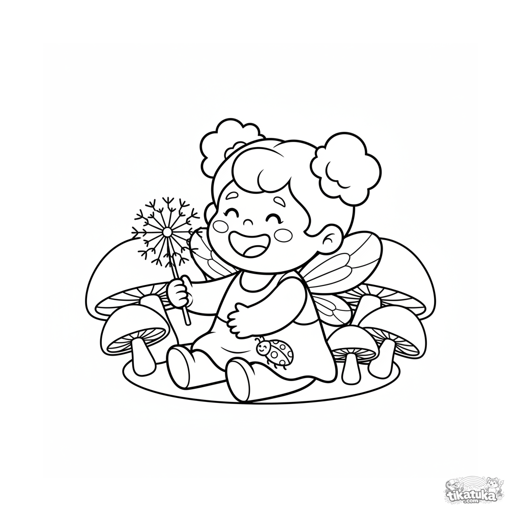 Einfaches Ausmalbild für Kleinkinder 2-3: Eine lächelnde Feen-Prinzessin sitzt im Kreis großer Pilze auf einer Wiese und hält einen Löwenzahn. Große Formen, breite Ränder.