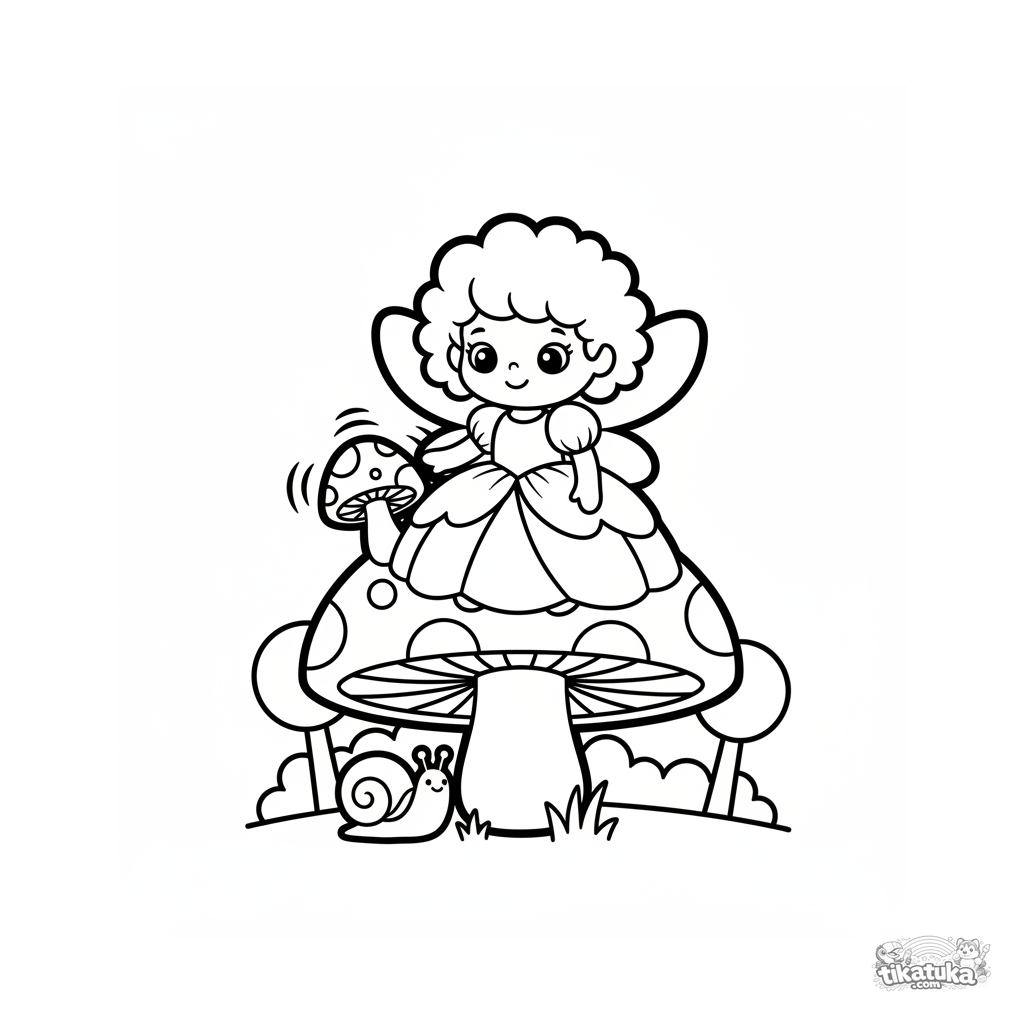 Einfaches Ausmalbild für Kleinkinder 2-3: eine süße Feenprinzessin auf einem Pilz im Wald. Große Formen und weite Ränder für erste Buntstifte.