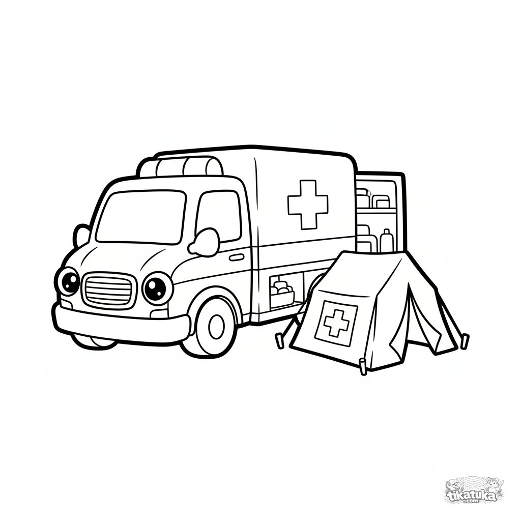 Ganz einfaches Ausmalbild für Kleinkinder 2-3: Ein freundlicher Krankenwagen-LKW mit rotem Kreuz in der Nähe eines Feldlazarett-Zelts.