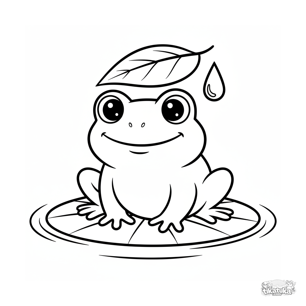 Ganz einfaches Ausmalbild für Kleinkinder 2-3: Ein großer lächelnder Frosch auf einem Seerosenblatt in einem Bach. Große klare Formen und weite Ränder.