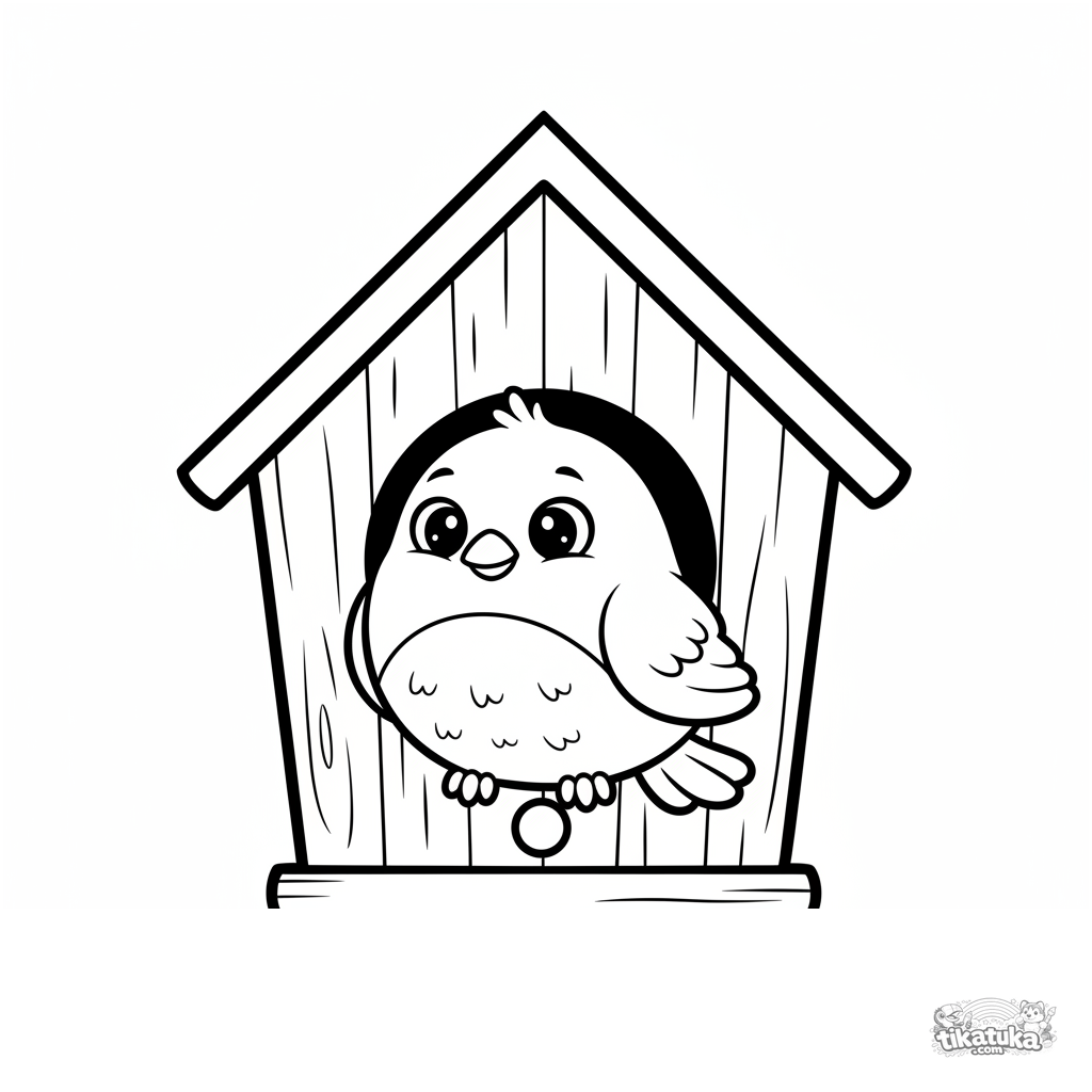 Ganz einfaches Ausmalbild für Kleinkinder 2-3: ein runder Vogel sitzt in einem Vogelhaus. Riesige weiße Ränder, dicke Umrisse, große Flächen zum Ausmalen.