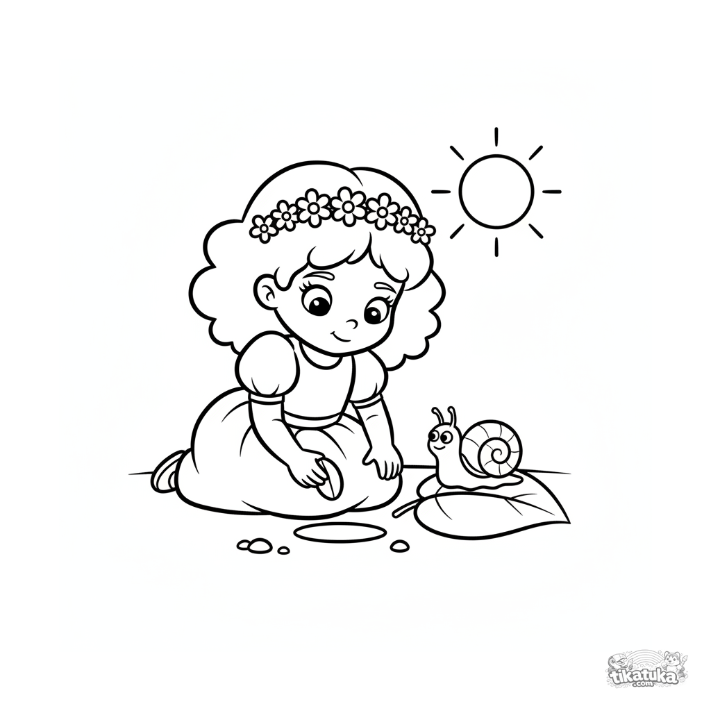 Einfaches Ausmalbild für Kleinkinder 2-3 Jahre: Eine kleine Prinzessin pflanzt einen Samen im Garten. Große Formen, weite Ränder.