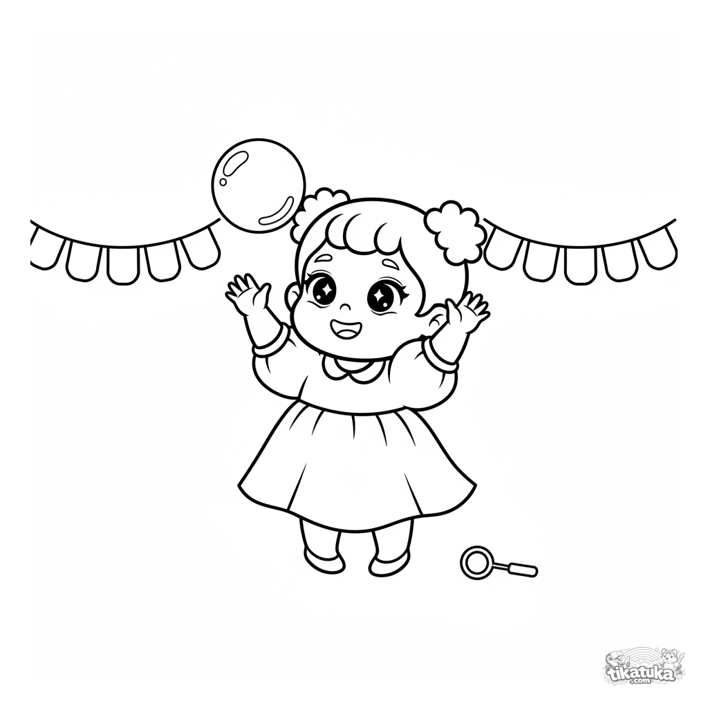 Ausmalbild für Kleinkinder 2-3: Ein kleines Mädchen in Entzücken greift nach einer großen Seifenblase im festlichen Saal. Sehr einfache, große Formen.